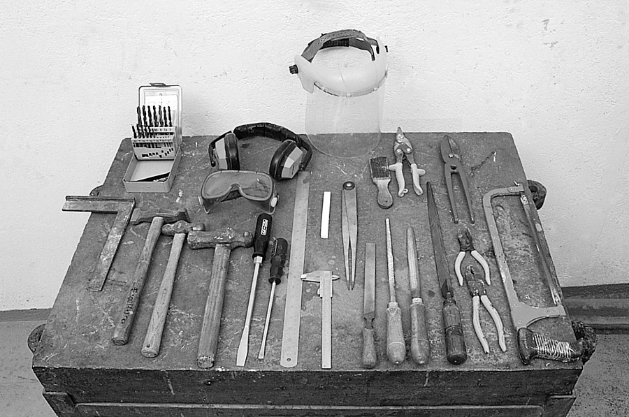 Las herramientas más usuales. De izquierda a derecha y de arriba abajo: caja de brocas, gafas, orejeras y máscara de protección, tiza, compás, carda, tijeras de corte, escuadra, martillos, destornilladores, pálmer, pie de rey, limas, alicates y sierra