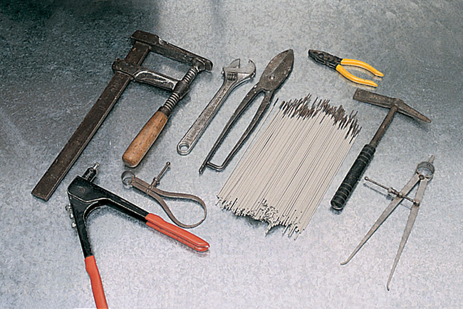 Algunas de las herramientas más comunes: sargento, llave inglesa, alicates, tenazas para clavos de remache, compás, etc.