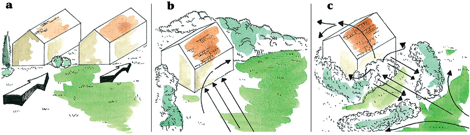 Con las plantas se pueden atenuar los efectos del viento: (a) un jardín que se encuentra en un pasillo en el que se canaliza el viento: un poco de vegetación, aunque sea baja, basta para frenar su intensidad; (b) las paredes de la casa son embestidas por el viento, y (c) la vegetación está colocada correctamente para desviar el flujo