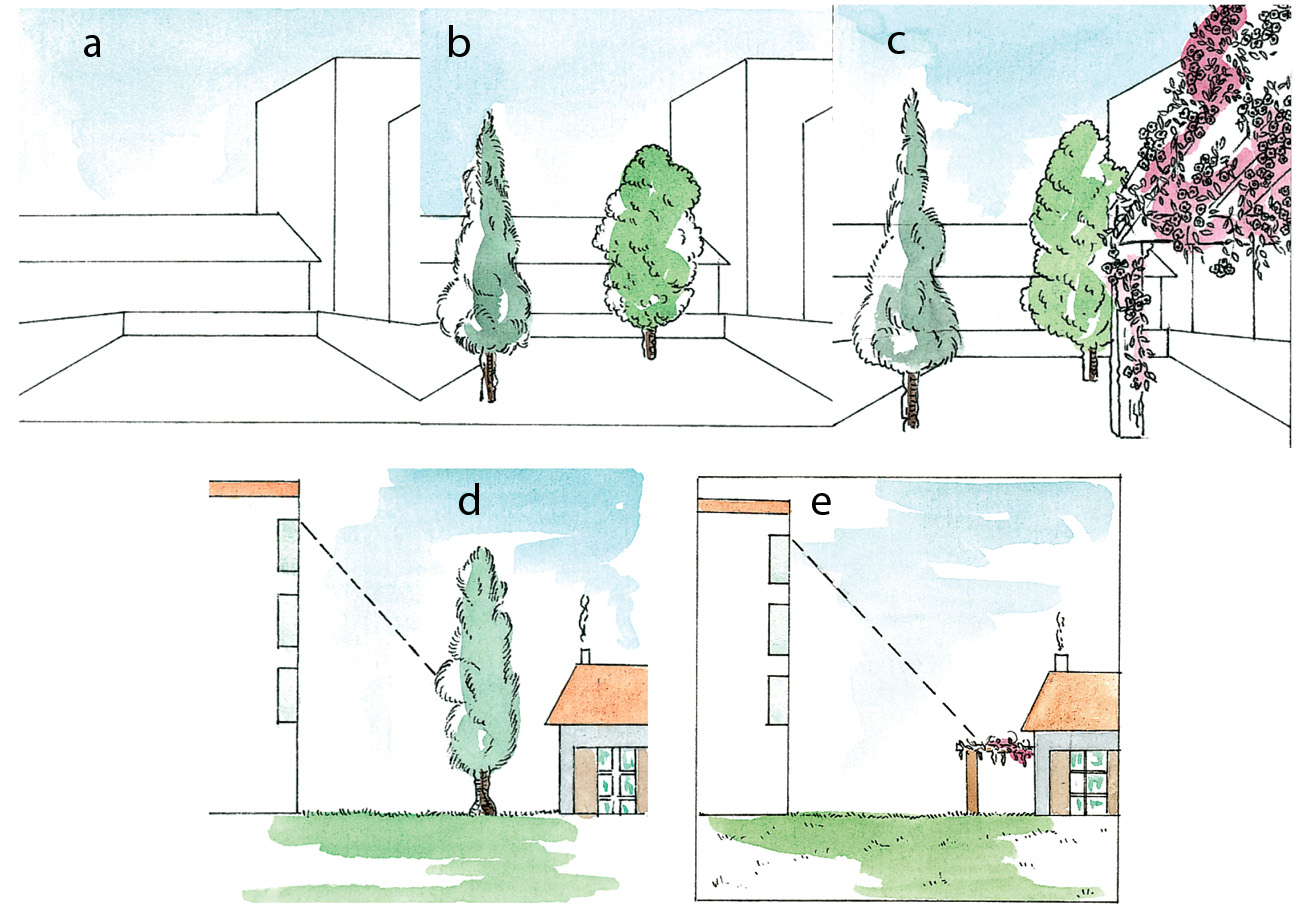 A menudo es muy importante conseguir satisfacer la exigencia de intimidad, sin crear una atmósfera opresora (a, b, c). A veces, un seto tupido e impenetrable puede reemplazarse por un único árbol colocado en el lugar adecuado (d) o por una estructura ligera tipo pérgola (e)