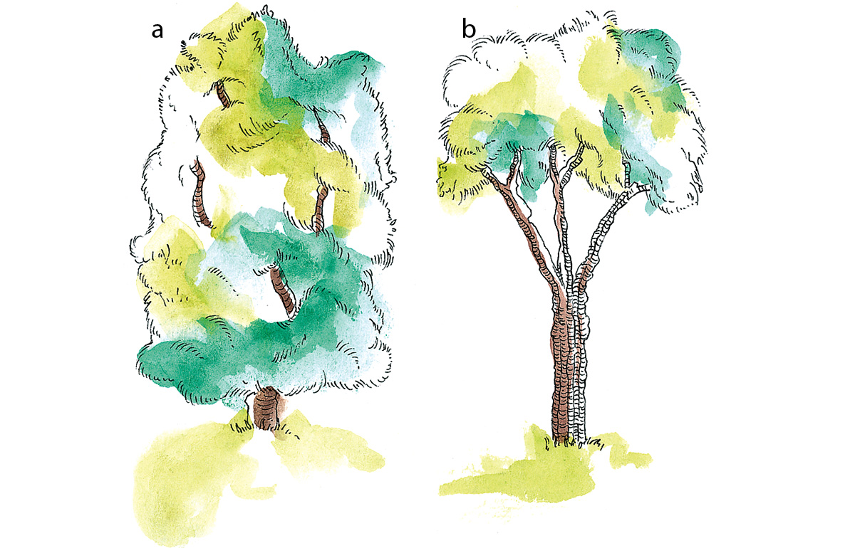 Es siempre aconsejable actuar con mucha cautela antes de mover plantas y verificar si no bastaría con algunas modificaciones. Con un podado hábil, se pueden corregir formas desagradables (a) y hacerlas más ligeras y esbeltas (b)