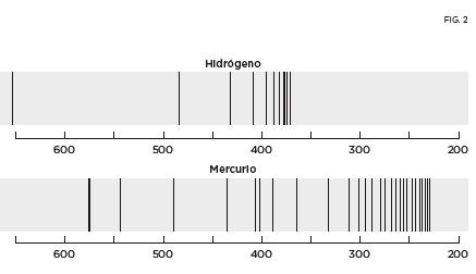 Los gases incandescentes emiten radiación, que puede analizarse mediante un espectrómetro. El elemento esencial de este aparato es un prisma, y los demás componentes, como escalas, lentes y otros dispositivos ópticos, sirven para poder medir con precisión las longitudes de onda o frecuencias luminosas, tanto en el espectro visible como en el ultravioleta o el infrarrojo. Según se refleja en la figura 1, cuando se hace pasar luz blanca por el prisma se observa un espectro continuo, un degradado de colores. En cambio, cuando se hace pasar la luz emitida por un gas incandescente solo se ven unas líneas brillantes en ciertos valores de la frecuencia, y por eso se habla en ese caso de espectro discreto. Además, si se analiza mediante un prisma la luz blanca que ha pasado antes a través de un gas, se observa que en el espectro continuo aparecen unas rayas oscuras, precisamente a las frecuencias que corresponden a las rayas brillantes emitidas por ese mismo gas incandescente. En la figura 2 se muestra una porción del espectro del hidrógeno y del mercurio, con longitudes de ondas comprendidas entre 660 y 190 nm (nanómetros, es decir, una mil millonésima de metro). El espectro visible corresponde a 700-400 nm. La frecuencia de cada línea se obtiene dividiendo la velocidad de la luz (300000 km/s) por la correspondiente longitud de onda. Esta frecuencia es proporcional a la diferencia de dos energías. Lo que se pretendía conseguir en los inicios de la física atómica era deducir los valores de estas energías, que dependen de ciertos números cuánticos, a partir de sus diferencias. Pronto se descubrió que no aparecían todas las posibles diferencias, lo que se reflejó en unas reglas de selección, que había que escribir en función de números cuánticos.