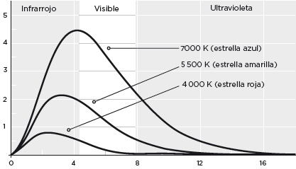 La curva de emisión de un cuerpo negro se parece a una campana asimétrica, cuya forma exacta depende de la temperatura. Cabe precisar que no siempre las palabras utilizadas en física se corresponden con su uso cotidiano: las estrellas se comportan como un cuerpo negro, y la medida de su curva de emisión permite conocer la temperatura de su superficie. Así se sabe que el Sol tiene una temperatura en su superficie de unos 6000 °C, en números redondos. Del estudio de la radiación de fondo existente en el universo se deduce que este está a una temperatura de unos 3 K.