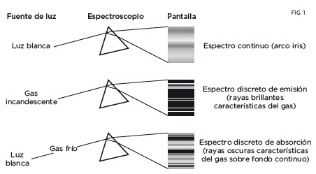 Cuando la luz del Sol atraviesa un prisma se forma un arco iris, un degradado continuo de colores. Cada color de este espectro continuo se caracteriza por una frecuencia o, equivalentemente, por una longitud de onda. Ambas magnitudes están relacionadas: el producto de la frecuencia por la longitud de onda es igual a la velocidad de propagación de la onda. Consideremos ahora un gas calentado hasta alcanzar la incandescencia, como sucede en un tubo fluorescente o en las lámparas que iluminan las carreteras. Si esa luz emitida por el gas se hace pasar por un prisma no se observa un degradado de colores, sino solamente unas líneas brillantes en ciertos valores de la frecuencia; por eso se habla en este caso de espectro discreto. Además, si se analiza mediante un prisma la luz blanca que ha pasado antes a través de un gas, se observa que sobre el espectro continuo aparecen superpuestas unas rayas oscuras, precisamente a las frecuencias de las rayas brillantes emitidas por ese mismo gas incandescente.
