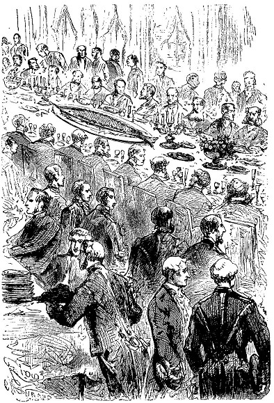 Después de la sesión, el doctor fue conducido al Club de los Viajeros, en Pall Mall, donde se celebraba un soberbio banquete. Las dimensiones de las piezas servidas a la mesa guardaban proporción con la importancia del personaje, y el sollo que figuraba en tan espléndido banquete no tenía tres pulgadas menos de longitud que el mismo Samuel Fergusson.