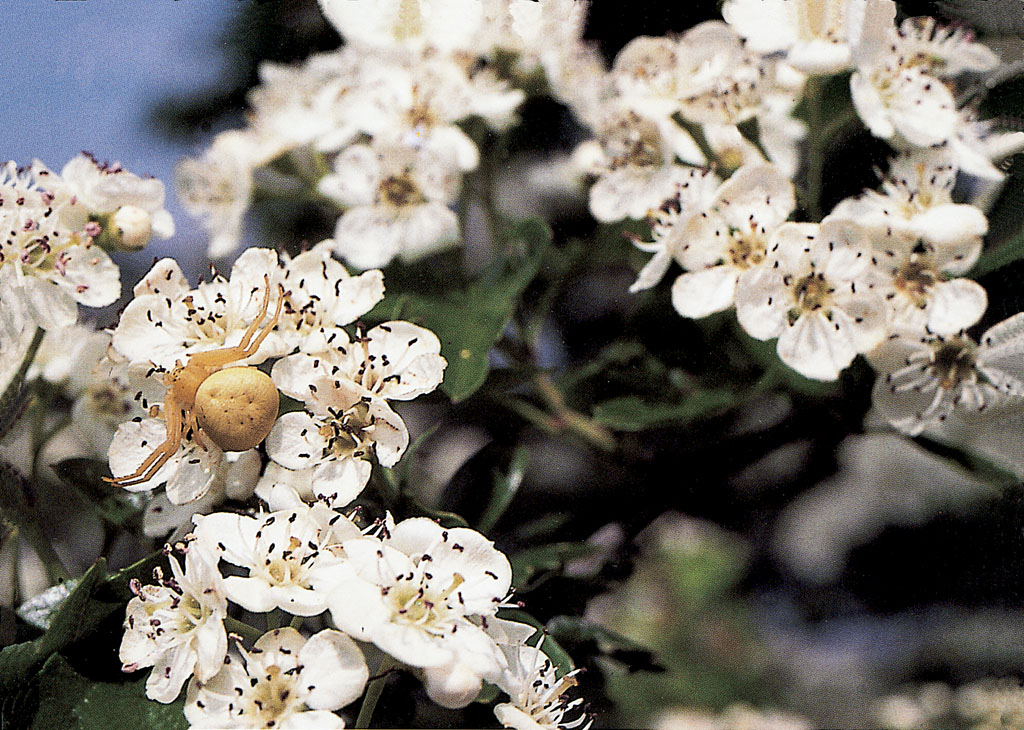 Araña cangrejo oculta entre las flores de un espino albar. © Y. Thonnerieux