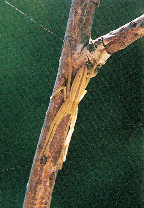 Paratibellus oblongus, prácticamente invisible sobre su rama. © V. Chansigaud