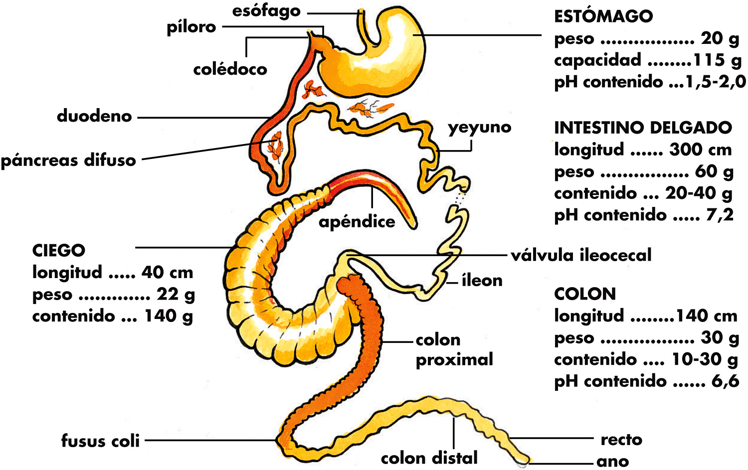 El ciego es el lugar donde se llevan a cabo las fermentaciones bacterianas que permiten la degradación de la fibra, mientras que la calidad de la excreción fecal depende de la actividad del colon proximal.