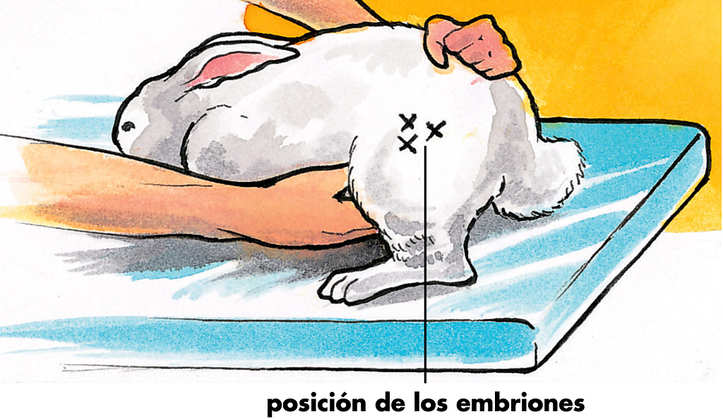 Vale la pena comprobar si las conejas están gestantes antes de preparar el nido o, en su caso, inducir un nuevo apareamiento. Para ello se puede recurrir a varios métodos: la dosificación hormonal, que es ardua y cara; el control de peso de la coneja, que no es exacto si varía la cantidad de alimento ingerido; la comprobación de la turgencia de las mamas, que se retrasa hasta el día 21 de gestación, es decir, muy tarde; o llevarla ante el macho, ya que en caso de estar preñada lo rechazará. No obstante, las garantías que ofrece esta última técnica no son absolutas.