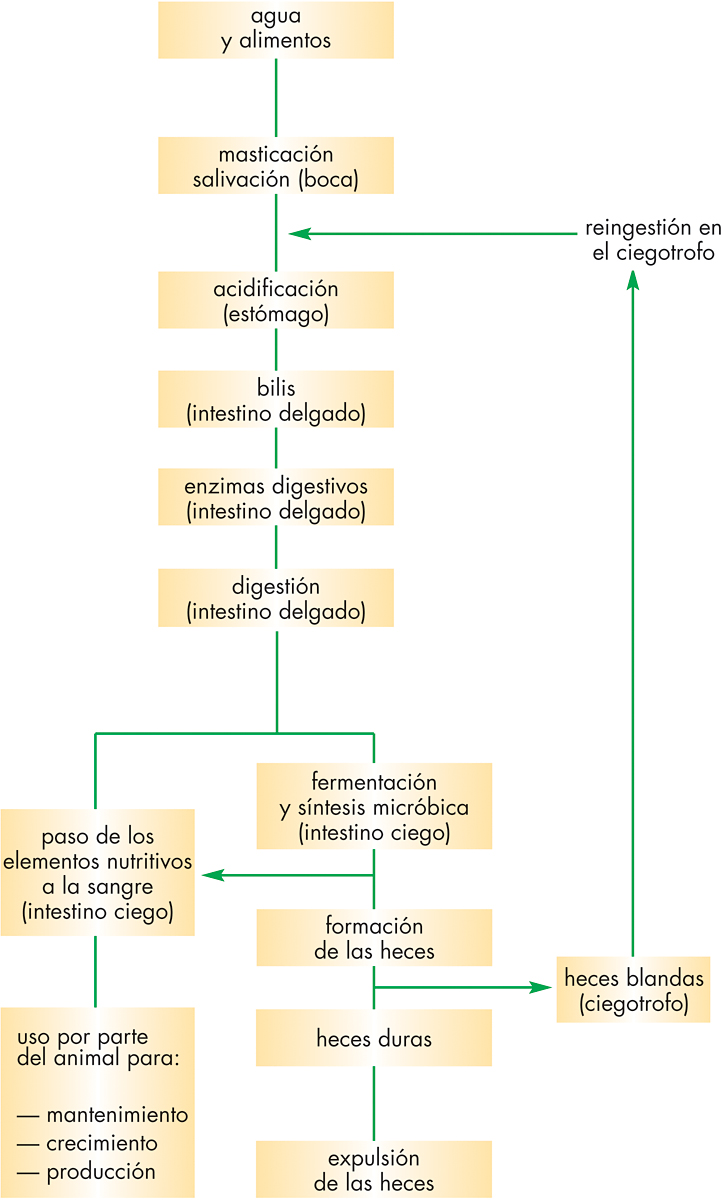 La primera consiste en el paso de la comida a través del tubo gastrointestinal, donde los principios nutritivos se someten a dos procesos degradantes: uno enzimático y otro fermentativo, en el que participan los microorganismos del intestino ciego. El segundo proceso digestivo se inicia con la producción de heces blandas. Consiste en la ciegotrofia, es decir, en la producción y reingestión, sin masticación, de excrementos procedentes directamente del ano.
