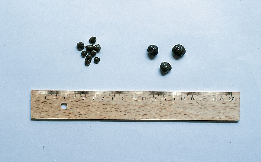 El ciegotrofo (a la derecha) tiene forma de bolitas que forman un racimo de aspecto brillante; su diámetro es mayor que el de las heces duras (a la izquierda)