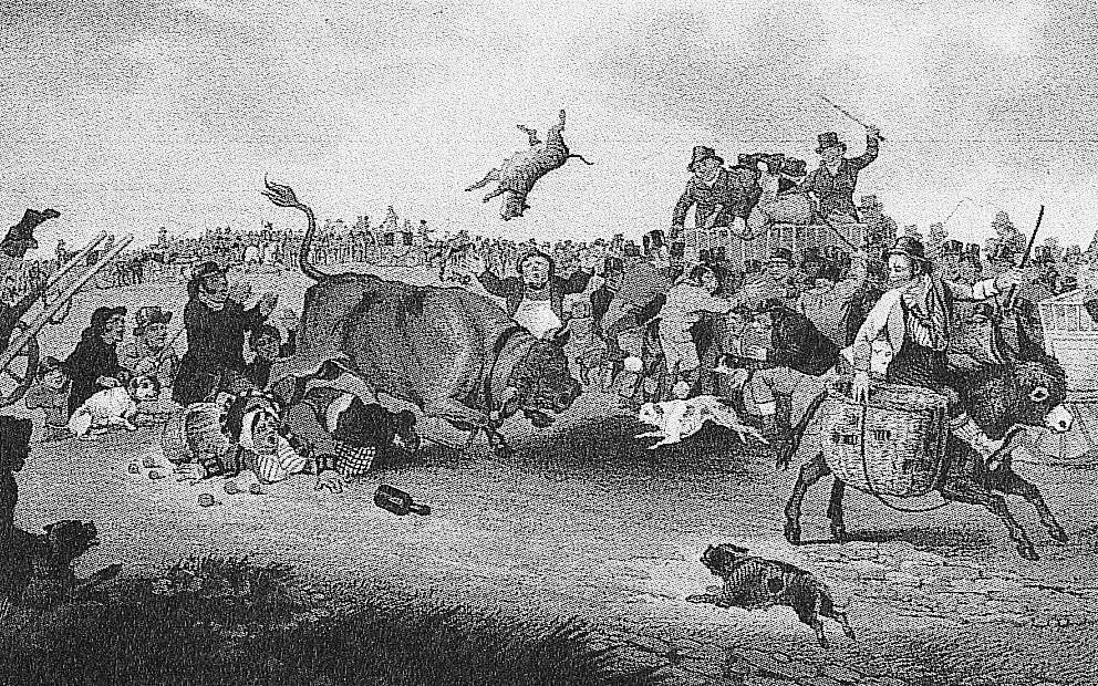Los perros acosaron y abatieron al toro, después de una furiosa lucha, y la escena complació tanto al señor del lugar que regaló el terreno en donde había tenido lugar la pelea al gremio de carniceros, a cambio de que el enfrentamiento se repitiera una vez al año.