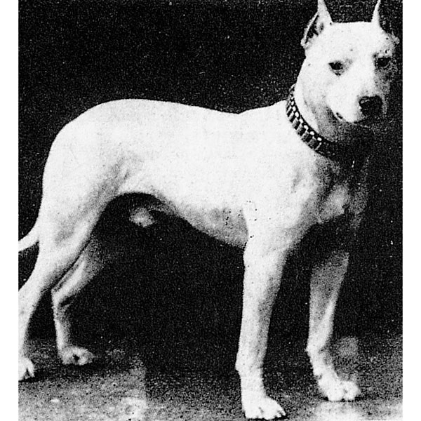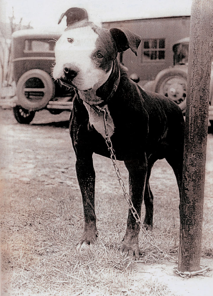 El american staffordshire terrier en el año de su reconocimiento (1936), representado aquí por X-Pert Black Ace; propiedad de Campeón y A. Ormsby