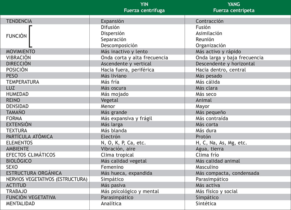 ¿En qué consiste esa polaridad? Ya en la antigüedad, los hombres observaron que en todo fenómeno existe una tendencia hacia la expansión y otra hacia la contracción o, lo que es lo mismo, una tendencia yin y otra yang. En función de qué tendencia predomine en un momento determinado, es decir, sabiendo si el fenómeno se encuentra en una fase expansiva (yin) o en una fase contractiva (yang), se puede prever qué evolución sufrirá. El yin y el yang son, en síntesis, fuerzas (la primera centrífuga, la segunda centrípeta) que operan en cualquier dimensión de la realidad. Si hablamos, por ejemplo, del movimiento, éste será más yin cuanto más lento sea, y más yang cuanto más rápido. Si nos referimos a las texturas, las blandas son más yin, y las duras, más yang. Si analizamos a una persona por su constitución, será más yin cuanto más alta y gruesa sea, y más yang cuanto más baja y delgada. En cuanto a los ambientes climáticos, el tropical es más yin y, en cambio, los ambientes fríos son más yang. Yin, en definitiva, es todo lo que conlleva difusión, dispersión, separación, descomposición, etc. Yang, por el contrario, es lo que implica fusión, asimilación, reunión, organización, etc. En el siguiente cuadro podemos ver éstos y otros ejemplos de la aplicación de la polaridad yin/yang en la realidad.