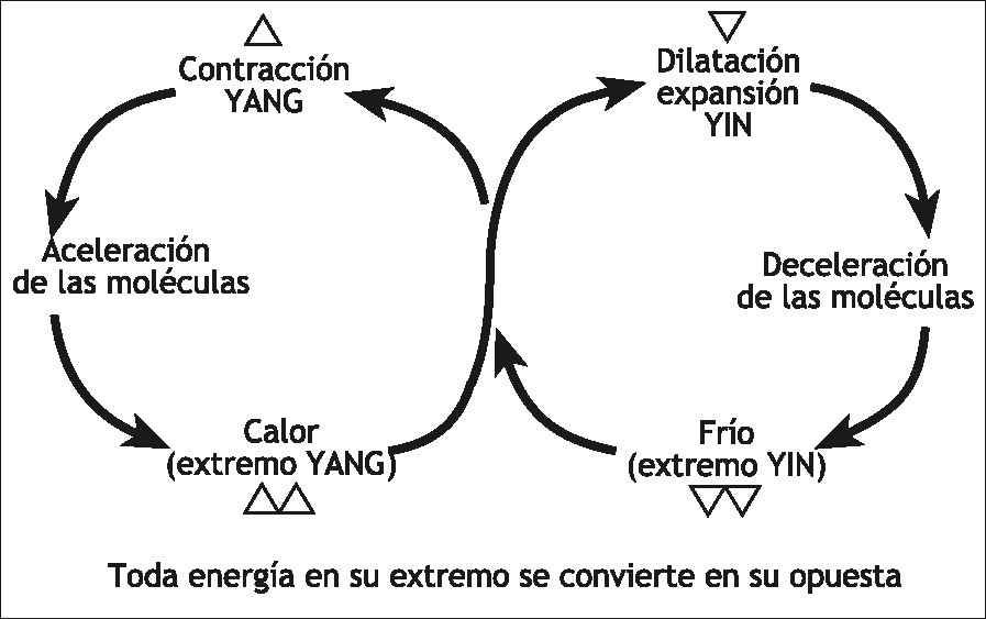 A partir de estos siete principios, la tradición oriental entiende el universo como una manifestación de dos energías antagónicas y complementarias, el yin —que representa la centrifugalidad— y el yang —que representa la centripetalidad—, las cuales se atraen mutuamente, interactúan y generan todos los fenómenos. Conviene tener en cuenta que nada es totalmente yin o totalmente yang. Cualquier fenómeno es una combinación de ambas energías en distintas proporciones, las cuales, además, varían constantemente. El equilibrio absoluto no existe, sino que, en los fenómenos, situaciones o sistemas estables, se da un equilibrio dinámico. Otras dos leyes fundamentales rigen a ambas fuerzas: por una parte, lo yin repele lo yin y lo yang repele lo yang; y, por otra, lo extremadamente yin produce yang y lo extremadamente yang produce yin.