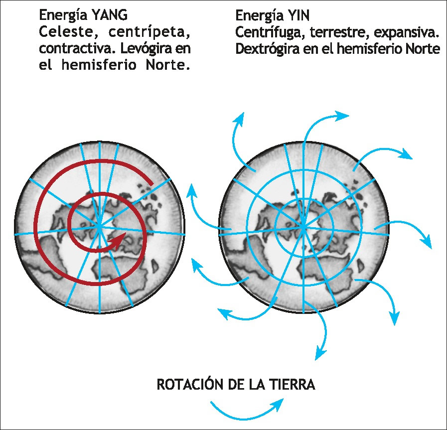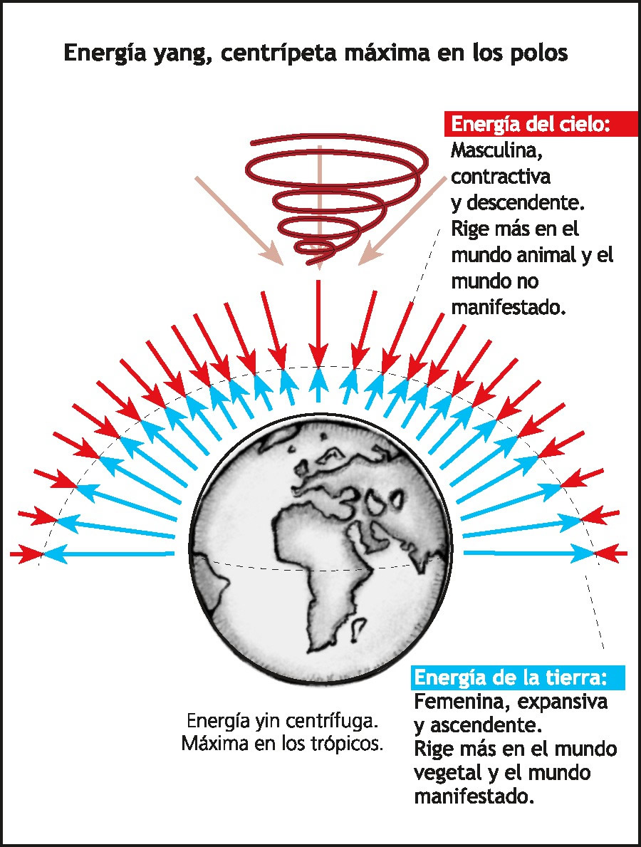 La energía terrestre, centrífuga y yin, es fruto de la rotación del planeta y alcanza su punto culminante en los trópicos. Allí crecen grandes árboles, grandes hojas, grandes insectos. Y es que la energía de la Tierra produce abundancia y pluralidad de seres. Por el contrario, la energía celeste, centrípeta y yang, predomina en los polos, donde la vida tiene mayores dificultades para desarrollarse: hay menor variedad de especies, con predominio absoluto de los animales —osos, focas…—, y las especies vegetales que empiezan a surgir conforme nos alejamos de los polos cuentan con características celestes (dureza, hojas pequeñas, más raíces y mayor condensación y resistencia que en los trópicos). Por otra parte, en los polos el mundo es más vibracional y energético (véase auroras boreales) que en el ecuador, donde hay más manifestaciones físicas materiales.