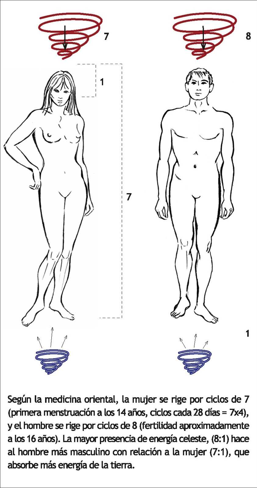 Al contrario que las plantas, que reciben principalmente su energía de la tierra, a la que están arraigadas, los seres humanos, como animales que somos, tomamos más energía del cielo que de la tierra. Somos, de hecho, el animal que más energía celeste es capaz de captar. La proporción entre energía celeste y energía terrestre de que estamos cargados es, aproximadamente, de siete a uno, que, por cierto, es también la proporción ideal, según los clásicos, entre el tamaño del cuerpo y el de la cabeza. Existe, sin embargo, una pequeña diferencia entre el hombre y la mujer que explica la polaridad y hasta la atracción entre ambos: el hombre está más cercano a la proporción de ocho a uno. De ahí que los ciclos de la mujer se rijan por múltiplos de siete y los del hombre por múltiplos de ocho. La mujer comienza a menstruar, o comenzaba a hacerlo, a los 14 años. Actualmente, la primera menstruación se ha adelantado debido al excesivo consumo de carne y de proteína animal —factores yang—, pero el ciclo sigue repitiéndose cada 28 días, un múltiplo de siete; y un embarazo dura 280 días. En el hombre, en cambio, la pubertad llega a los 16, un múltiplo de ocho; y los 40 marcan en general un momento significativo.