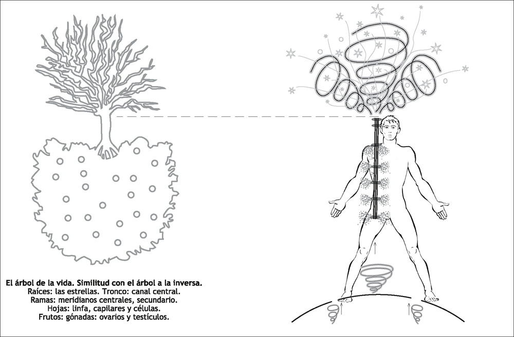 Según las medicinas orientales, la energía terrestre entra en el cuerpo humano por los pies y por el perineo; la celeste entra principalmente por la cabeza. Ambas circulan por un mismo canal central y van cargando una serie de centros de energía, que los orientales denominan chakras, los cuales a su vez la distribuyen a través de nadis (o meridianos internos y externos) por todo el organismo. La energía sufre en ese trayecto un proceso progresivo de materialización, de más sutil a más densa, que alcanza su culminación en la linfa y las células.