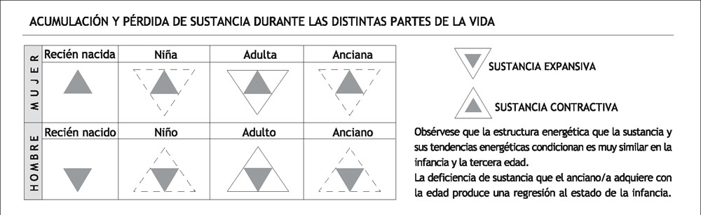 Ya en la vejez, tanto el hombre como la mujer van perdiendo la capacidad de regenerar sus tejidos, que se vuelven más secos y menos turgentes. La sustancia que a lo largo de la vida han ido acumulando en los tejidos, se desgasta y emerge el núcleo interior (yang, concentrado y activo en la mujer; y yin, diluido y pasivo en el hombre).