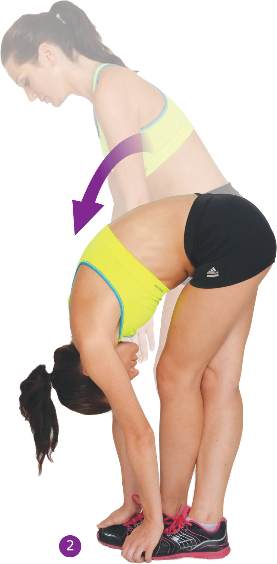 Paso 2 Inclínate hacia delante todo lo posible hasta tocar el suelo con la punta de los dedos. Si puedes, agárrate la punta de los pies o, si optas por una variante más exigente, coloca las manos planas sobre el suelo.