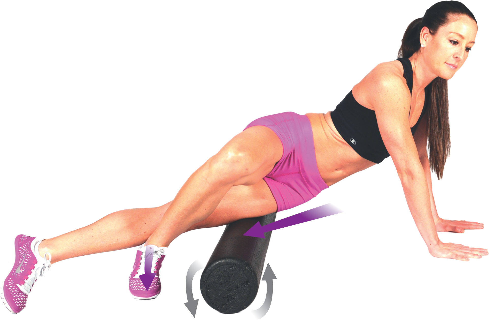 Paso 1 Túmbate boca abajo, cargando el peso sobre las manos; la parte inferior del cuerpo debe estar ligeramente girada, de manera que tu pierna izquierda quede apoyada sobre un rodillo de espuma situado entre la rodilla y la cadera. Cruza la pierna derecha sobre el muslo izquierdo; los dos pies deben tocar el suelo. Carga la mayor parte del peso sobre la pierna de debajo mientras relajas la otra.