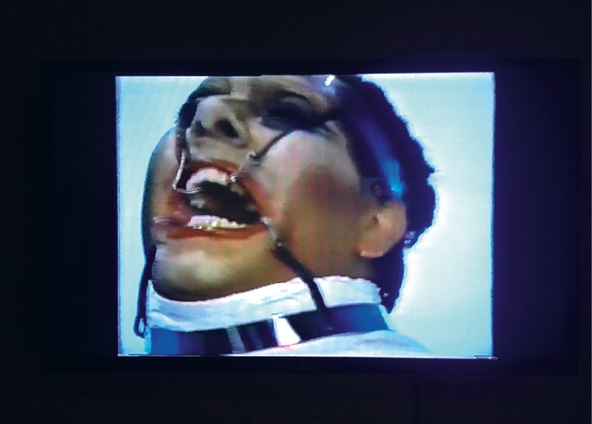 Es la simultaneidad la que se convierte en el sustrato para la efectividad de la video-instalación, simultaneidad que permite la repetición de la performance en los tres monitores; reproducción que “robustece” la presencia del artista. Es a Leppe triplicado el que vemos en el ensamble, investido de una coraza que, más que protegerlo, por su materialidad, le atribuye la necesidad de sanación. Es el cuerpo intervenido, pero igualmente histriónico el que contrasta con el cuarto monitor, donde la madre relata un parto tortuoso, por él, este niño sobredimensionado, que “tuvo que ser sacado con fórceps, y además le succiona el calcio”, la deja sin dientes y sin fuerza. El peso de ser la madre de Leppe, que al parecer revalida y replica el artista en su forma onerosa y dura de mostrarse frente a los otros.
