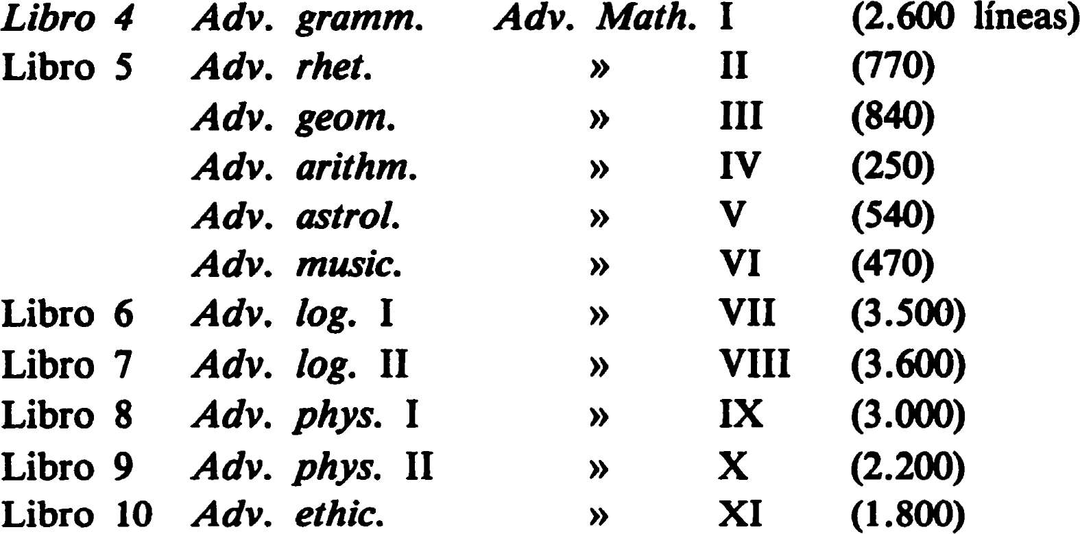 Los otros siete libros ofrecen un desarrollo pormenorizado del contenido de los libros II y III de los Esbozos . El conjunto de esos siete libros suele designarse con el título Adversus Mathematicos , que podemos traducir por «Contra los grandes Maestros»; pero no hay una terminología unánimemente aceptada. Algunos autores mantienen los títulos de las diferentes secciones; otros se limitan a numerarlas, desde la I a la XI. Esta es la correspondencia: