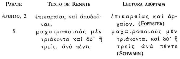 Los pasajes en que no he seguido la edición de Rennie (Demosthenis orationes, Oxford, 1921 [reimpr. 1974]) son: