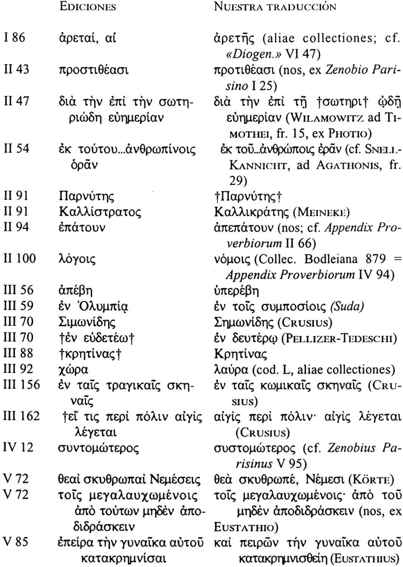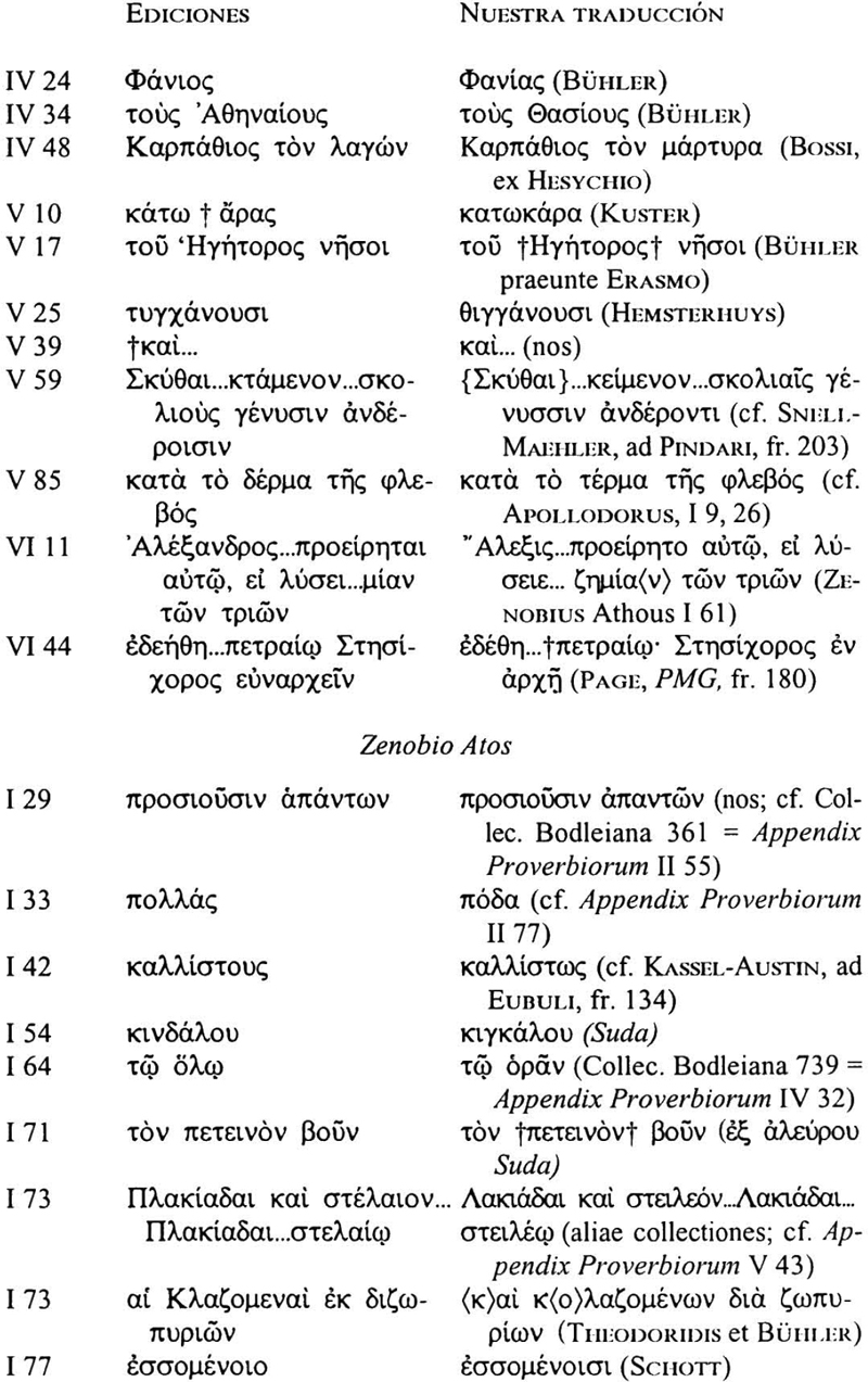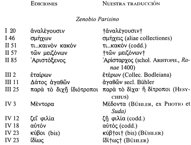 Para Zenobio Parisino seguimos la edición de Leutsch-Schneidewin; para Zenobio Atos, la edición de E. Miller, excepto para los cuarenta primeros proverbios de la serie segunda (que traducimos según la edición de Bühler), y la primera parte de la serie quinta (para la que nos basamos en la edición de Spyridonidou-Skarsouli); la serie cuarta se traduce a partir del texto dispuesto por Crusius. En todos los casos se han tenido también en cuenta las precisiones que se hacen en otros trabajos, especialmente los recogidos en el Supplementum al Corpus Paroemiographorum Graecorum. De las ediciones mencionadas nos apartamos en los siguientes pasajes: