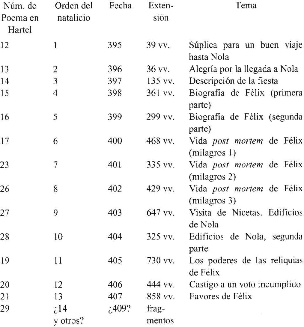 Así es que nuestro autor compuso a partir del año 395 hasta el 407 una serie de poemas anuales sobre el nacimiento dedicados a Félix de los que han sobrevivido trece completos y fragmentos de un decimocuarto. La cronología de los natalicios 92 es la siguiente: