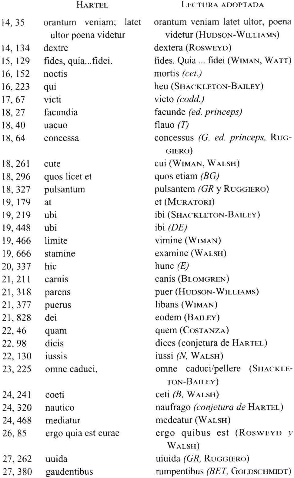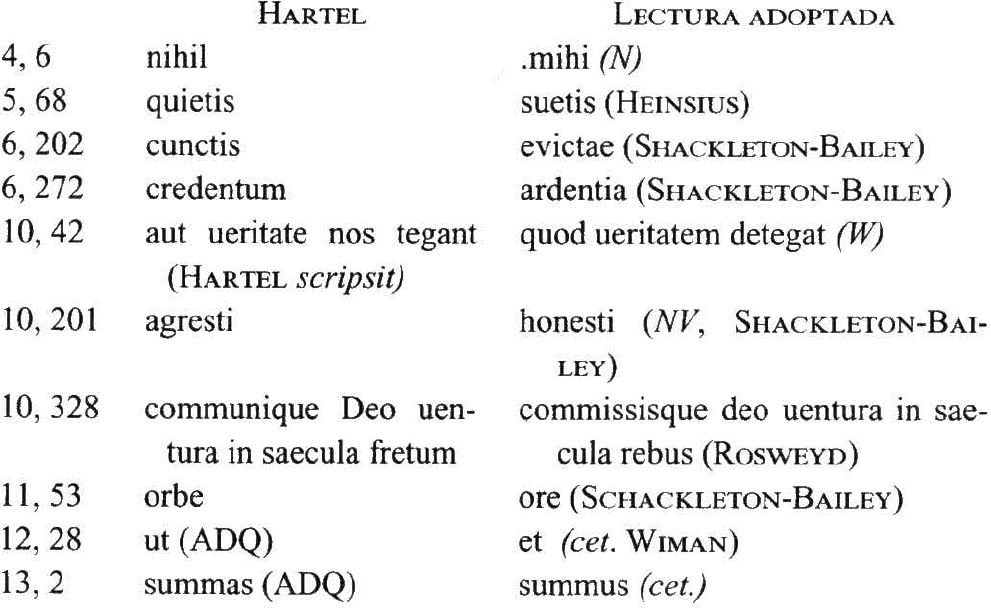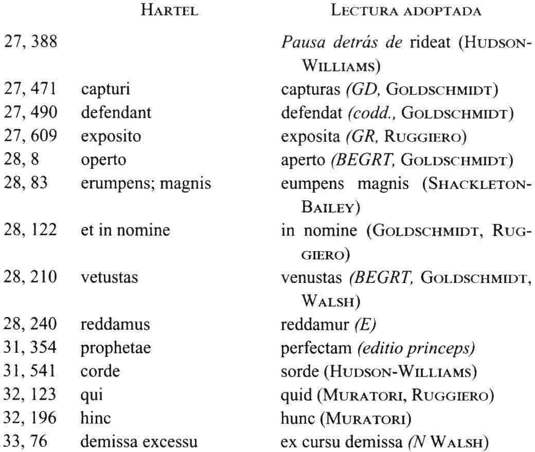 Me he basado en la edición de Hartel y señalo a continuación los lugares en los que he seguido otras lecturas.