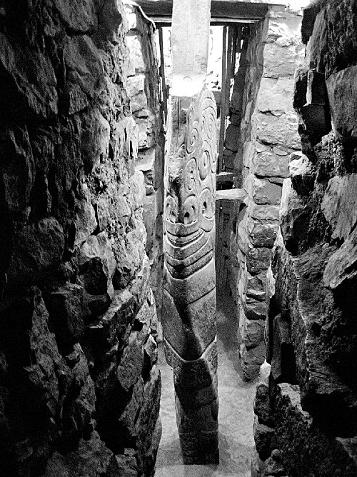 El objeto es una desconcertante piedra tallada de cuatro metros y medio de altura en la que se observa una extraña divinidad antropomorfa. La pieza está clavada dentro del templo de piedra, en una cámara a la que hay que llegar después de sortear un laberinto subterráneo. Se le llama «lanzón» —así lo bautizó el estudioso peruano José Toribio Polo— porque tiene la forma de una punta de proyectil gigantesca, cuyos extremos se enclavan sólidamente en el suelo y el techo de la galería. Supongo que el sabio italiano Antonio Raimondi tuvo la misma impresión que yo cuando lo vio por primera vez en sus exploraciones del templo a fines del siglo XIX. Para otros investigadores como Julio C. Tello (1923) y John Rowe (1962), el «lanzón» era el principal objeto sagrado de Chavín, la representación de una deidad poderosa. Un «protector».