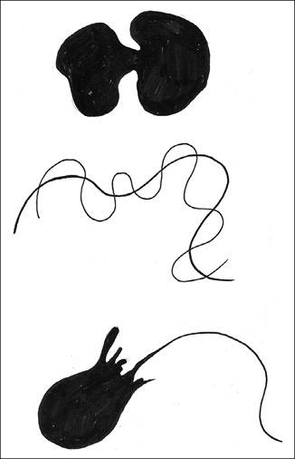 Al nivel más rudimentario, la bacteria combina una célula procariota y un flagelo que parece un hilillo. La célula es el globo, el flagelo la línea: uno contribuye con energía y la otra con motilidad. Juntas conspiraron para gobernar el mundo y, de varias formas, aún lo hacen. Cuando se busca se encuentran globos y líneas por todas partes. Piensen en el desarrollo de tubérculos a lo largo de los zarcillos de un rizoma. Las papas en un saco no son más que volúmenes pero sin embargo en la tierra son reservas de carbohidrato a lo largo de una raíz en forma de hilo, desde donde una nueva planta podrá brotar. El renacuajo, desde el momento en que se escabulle del glóbulo que lo engendra, lleva una cola lineal. El gusano de seda, una criatura que durante su corta vida expande su volumen a un factor de diez mil debido al apetito voraz que tiene por las hojas de la morera, hila una línea del más fino filamento con el que construye su capullo. Y ¿qué es un capullo? Es un lugar que usa esta larva amorfa para convertirse en una criatura alada que puede volar a lo largo de esa línea. Observe a esa artista consumada, tejedora de líneas, la araña, con su cuerpo-gota, colgando desde el borde de la línea que ha hilado, o acechada desde el centro de su telaraña. Los huevos son un tipo de globo, los peces van de globos a líneas al nacer y lanzarse como un rayo por el agua. Lo mismo se puede decir de los pájaros cuando se lanzan al aire desde sus nidos. Y el feto mamífero, agarrado al interior de la matriz por la línea de la cuerda umbilical que al nacer es expulsado al exterior para luego volver a aferrarse con sus dedos al cuerpo materno.