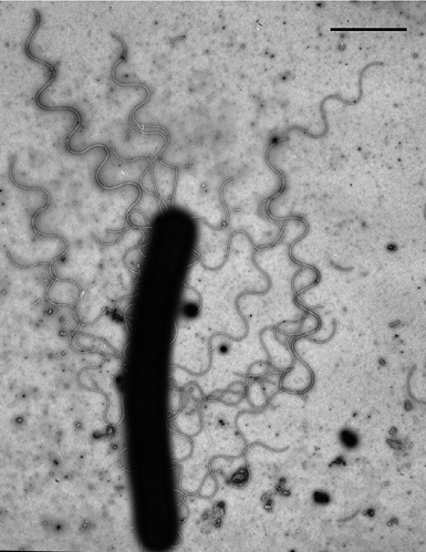 Micrografía electrónica de transmisión de la bacteria Vibrio Parahaemolyticus. El cuerpo de la célula en forma de varilla tiene una anchura de 0,5 a 0,75 micrones, y una longitud de alrededor de 5 micrómetros. Los flagelos tienen aproximadamente 20 nanómetros de diámetro. La barra de tamaño en la parte superior derecha de la imagen indica 1,5 micrones. Imagen cortesía de Linda McCarter y la Universidad de Iowa.