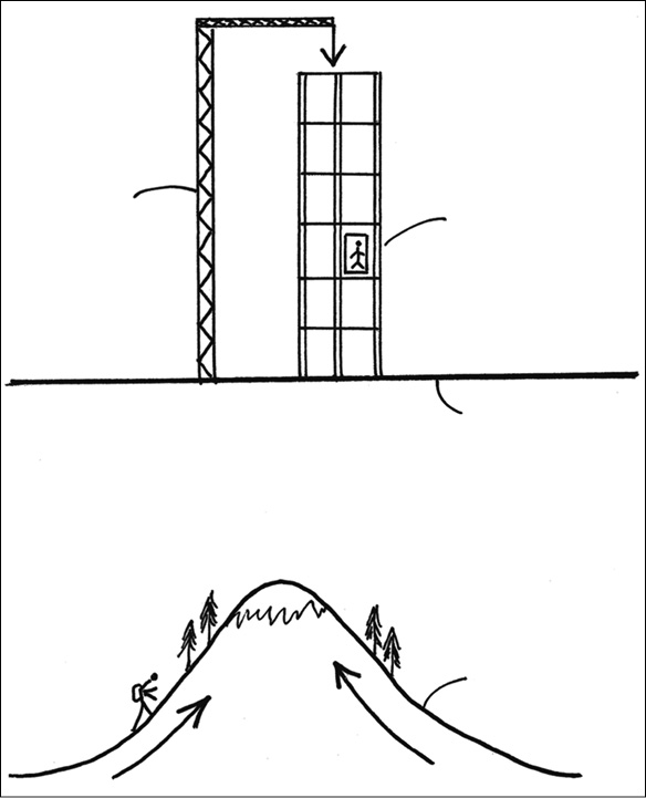 Las verdaderas montañas, por supuesto, no están construidas como los rascacielos, no importa cuánto queramos pretender que lo son. No están construidas desde bloques sino que emergen de los movimientos tectónicos de la corteza terrestre. Sus mismas formas, aunque puedan parecer eternas en relación al periodo de tiempo que dura la vida humana, solo son evidencia de una obra en proceso, un trabajo que nunca empezó y nunca terminará. Cada cadena montañosa es, en efecto, una obra de construcción perpetua. Las fuerzas geológicas y meteorológicas en juego, en montaña-construcción son muchas y variadas y este no es el lugar para revisarlas. El punto general que aquí quiero destacar es que cada montaña es un pliegue del suelo, no una estructura colocada encima de él. Desde el pliegue, el material de la tierra es impulsado hacia arriba, tal vez –en el caso de actividad volcánica– hasta para hacer erupción. A falta de un término mejor llamaré a esto el “modelo de extrusión”. Mientras que en el modelo rascacielos los componentes se dejan caer desde encima sobre la base, en el modelo de extrusión surgen dentro de la estructura, desde abajo. Aquí, el suelo es levantado por una hinchazón de la tierra, muy parecido al modo en que el furúnculo levanta la piel. Así, el suelo es suelo, no importando cuán empinado o escarpado, y el escalador se mantiene en contacto con él, ya sea vaya caminando, encaramándose o practicando rappel, en los faldeos o la cumbre. Ciertamente, si pensamos en la montaña en términos de la topología de suelo y no como verticalidad pura, la cumbre pierde mucho de su encanto, ya que no es más de que un pedazo de suelo que, incidentalmente, es más alto que el terreno a su alrededor.