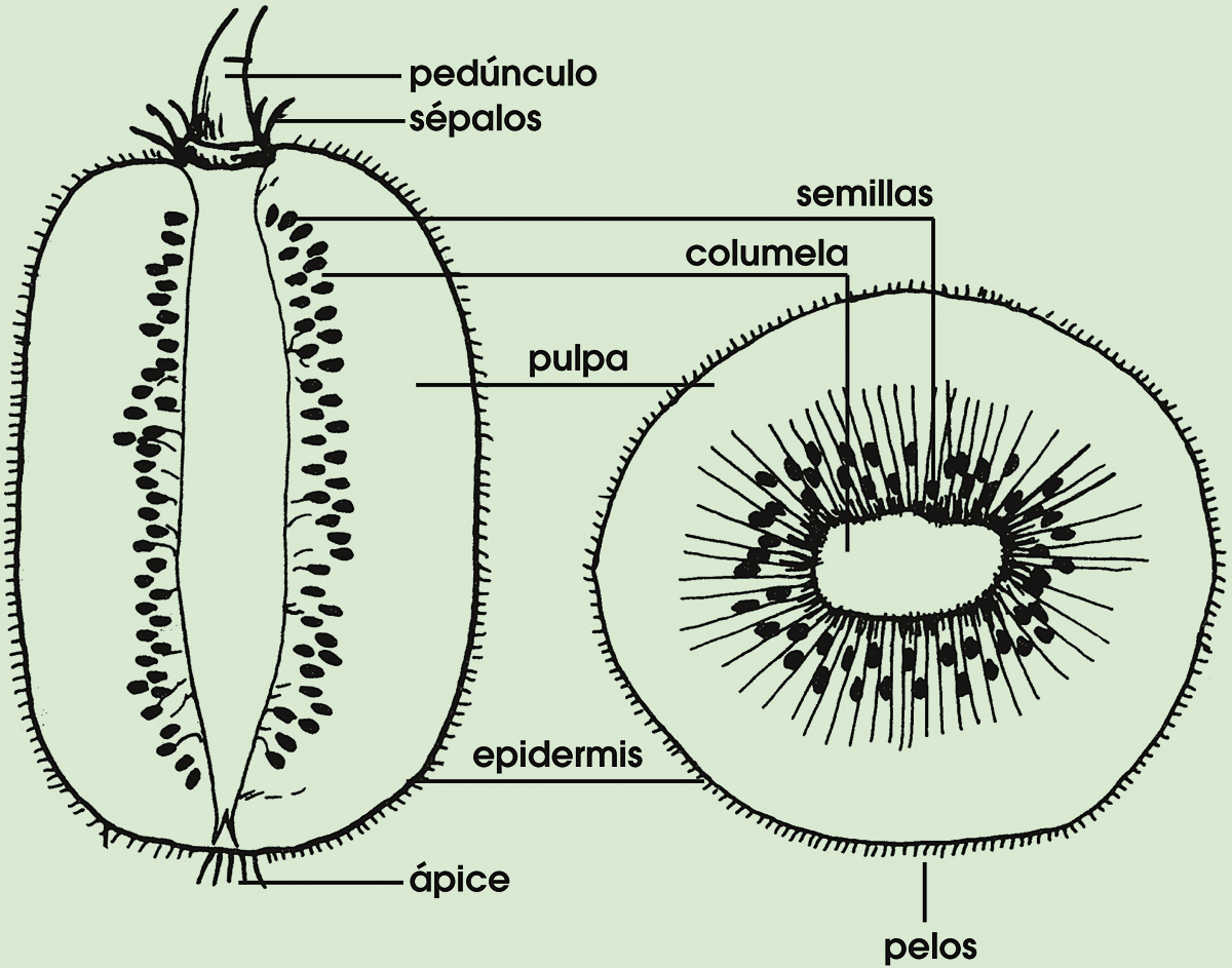 El kiwi es una liana fructífera de tipo sarmentoso científicamente conocida como Actinidia chinensis. El género Actinidia, cuyo nombre deriva del griego aktis (radio), que se refiere a las numerosas divisiones radiales del estilo persistentes durante el desarrollo del fruto y hasta su madurez, está sistematizado en la familia Actinidiáceas (Van Tieghem, 1899) que comprende, además, los géneros cloematoclethra y Sladenia.