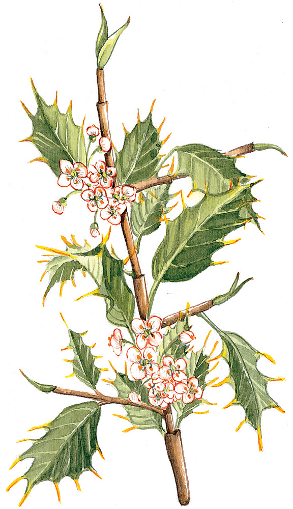 Flores: sin pedúnculos y espinosas; pecioladas las masculinas, de color amarillo verdoso o rojo verdoso; colgantes y esféricas las femeninas, verdes.