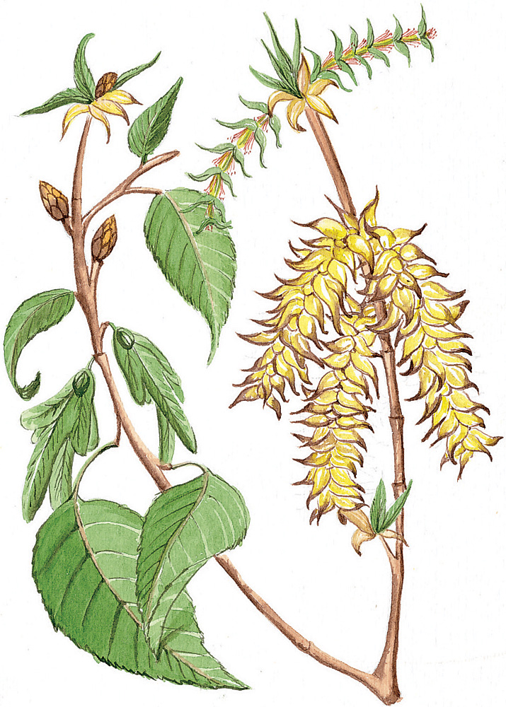 Flores: amentos unisexuales que brotan en el mismo árbol; las masculinas son de color gris oscuro o gris verdoso en floraciones colgantes; las femeninas son de color rojizo, con amento piloso de 3 o 7 cm.