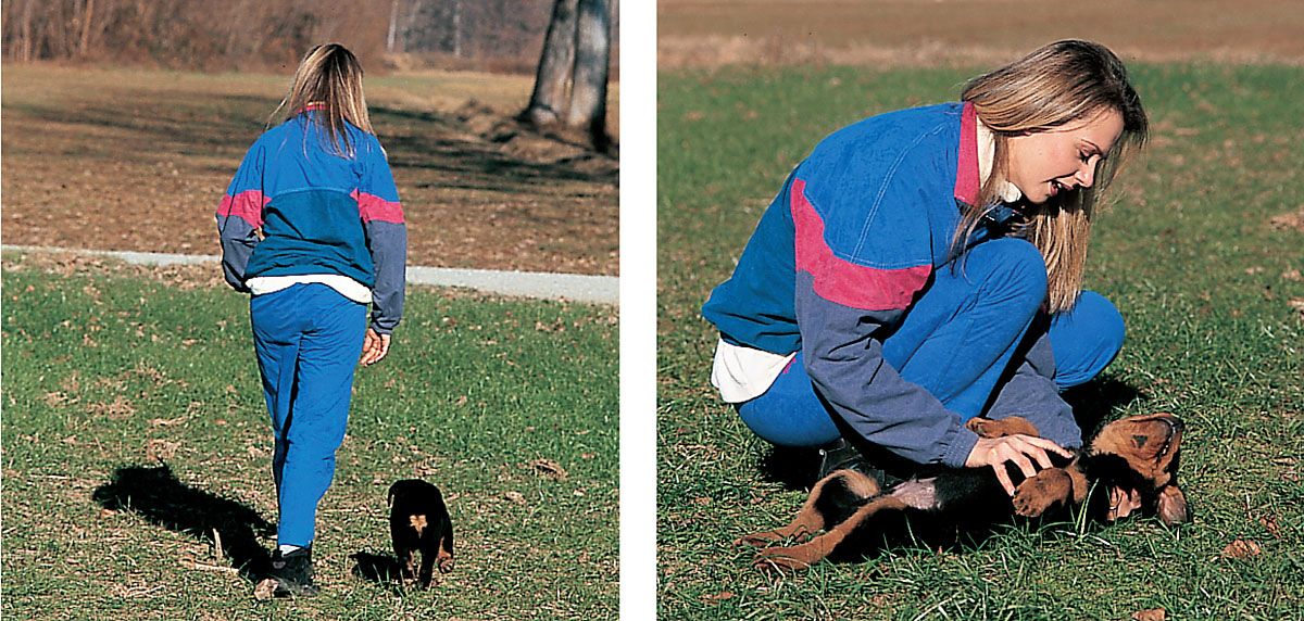 Periodo de afirmación de la dominancia (12-16 semanas): en este periodo sea deben evitar taxativamente los juegos violentos, ya sea con los hermanos o con el hombre. No deberá permitirse que el cachorro con tendencia dominante, especialmente en estas semanas cruciales, se comporte con excesiva agresividad. Cuando salgan a pasear no habrá que dejarles morder la correa, puesto que deberá considerarla como la prolongación de la mano del dueño.