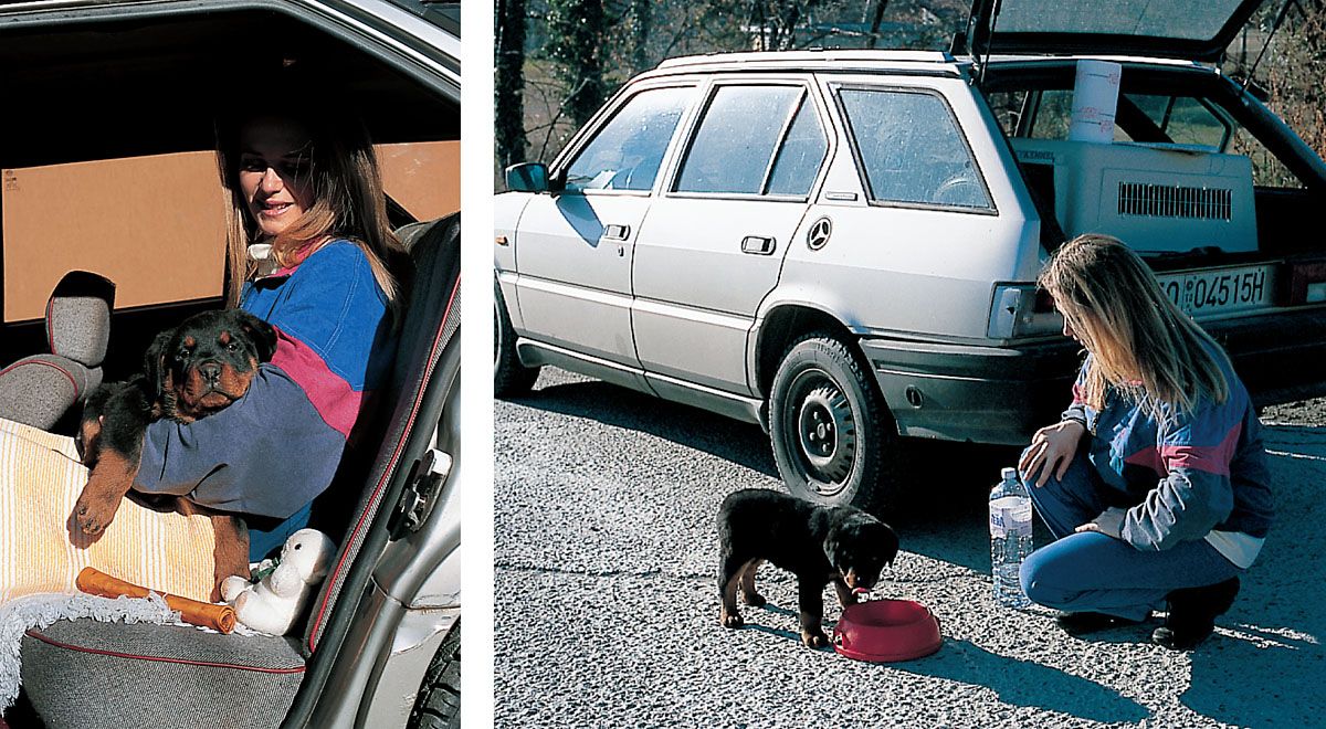 Si el viaje es largo, cuando veamos que el cachorro se ha tranquilizado es conveniente introducirlo en la jaula de viaje en cuyo interior habremos dispuesto papel de periódico cortado en tiras para absorber la orina. Si el viaje dura horas, haremos una parada en un lugar alejado del tráfico y haremos bajar al cachorro para que desentumezca las patas. Probablemente no defecará, atemorizado por las novedades; esto no deberá preocuparnos: le haremos beber un poco de agua fresca y cuando volvamos a introducirlo en la jaula le daremos una galleta para roer especial para perros. Si se le ve agitado, lo acariciaremos con la mano, si bien evitaremos cogerlo en brazos para que no crea que somos víctimas de cualquier emoción suya. Debemos darle la impresión de que comprendemos sus dificultades pero que no seremos nunca sus esclavos.