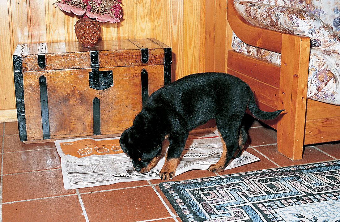 No deberá preocuparnos que el cachorro haga sus necesidades fisiológicas en casa, porque a él también le gusta vivir en un lugar limpio y carente de olores desagradables. Cuando haga su primera micción, impregnaremos un papel de periódico que colocaremos sobre otro limpio en un lugar apartado. Cuando veamos que se dispone de nuevo a orinar, lo llevaremos al lugar en donde pusimos el papel de periódico al tiempo que le felicitamos. En poco tiempo veremos que él solito irá a buscar el periódico cuando tenga que hacer sus necesidades.