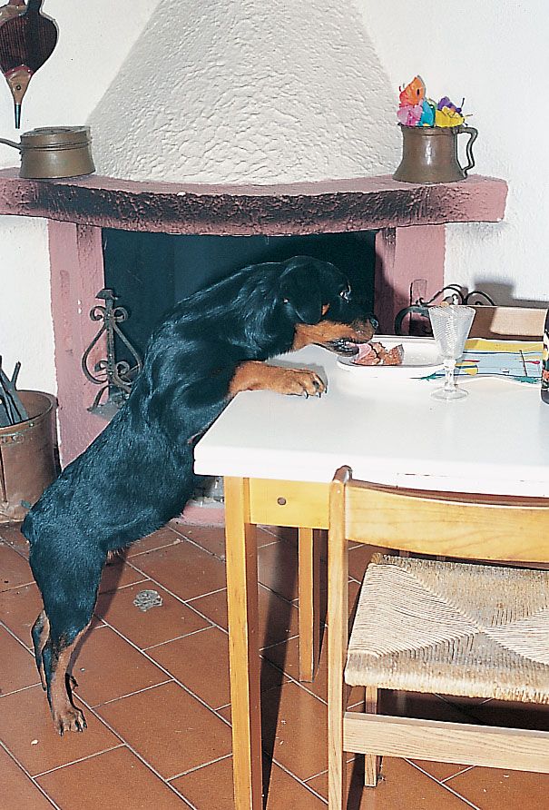 El perro es ladrón por naturaleza, o mejor dicho, considera suyo todo lo que encuentra en su territorio. El asado listo para ser servido, la caja de los caramelos o los objetos de la casa —especialmente aquellos a los que el dueño tiene más apego— son fuente de deseo para el perro, que busca así la forma de reafirmar su dominio. Conviene enseñarle pronto a no hacerlo, pero para ello deberemos esperar a pillarlo con las manos en la masa.