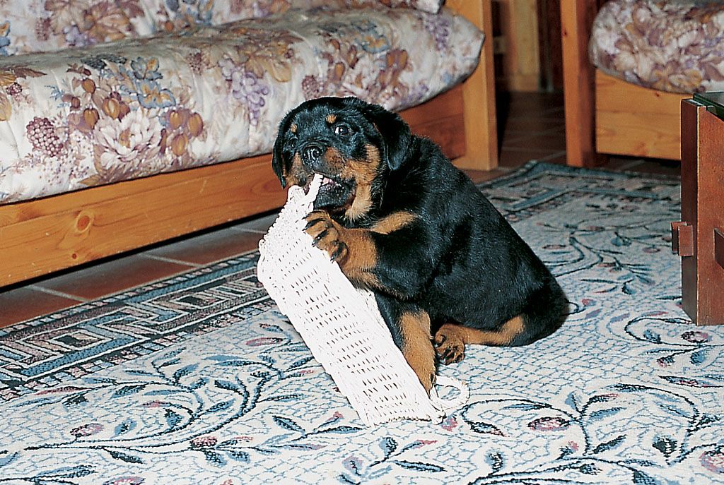 El cachorro que roe un objeto que encuentra o una prenda de vestir siempre tiene algún problema. Puede ser la dentición, aunque a menudo es un síntoma de tensión que se exterioriza casi siempre cuando no se siente querido, sino simplemente tolerado. Es un modo de desahogar la tristeza, y que repite cuando se le riñe. La solución consiste en cambiar el trato que se dispensa al cachorro mostrándole nuestro desagrado cuando lo sorprendemos in fraganti, y jugando más con él para que se sienta de nuevo aceptado.