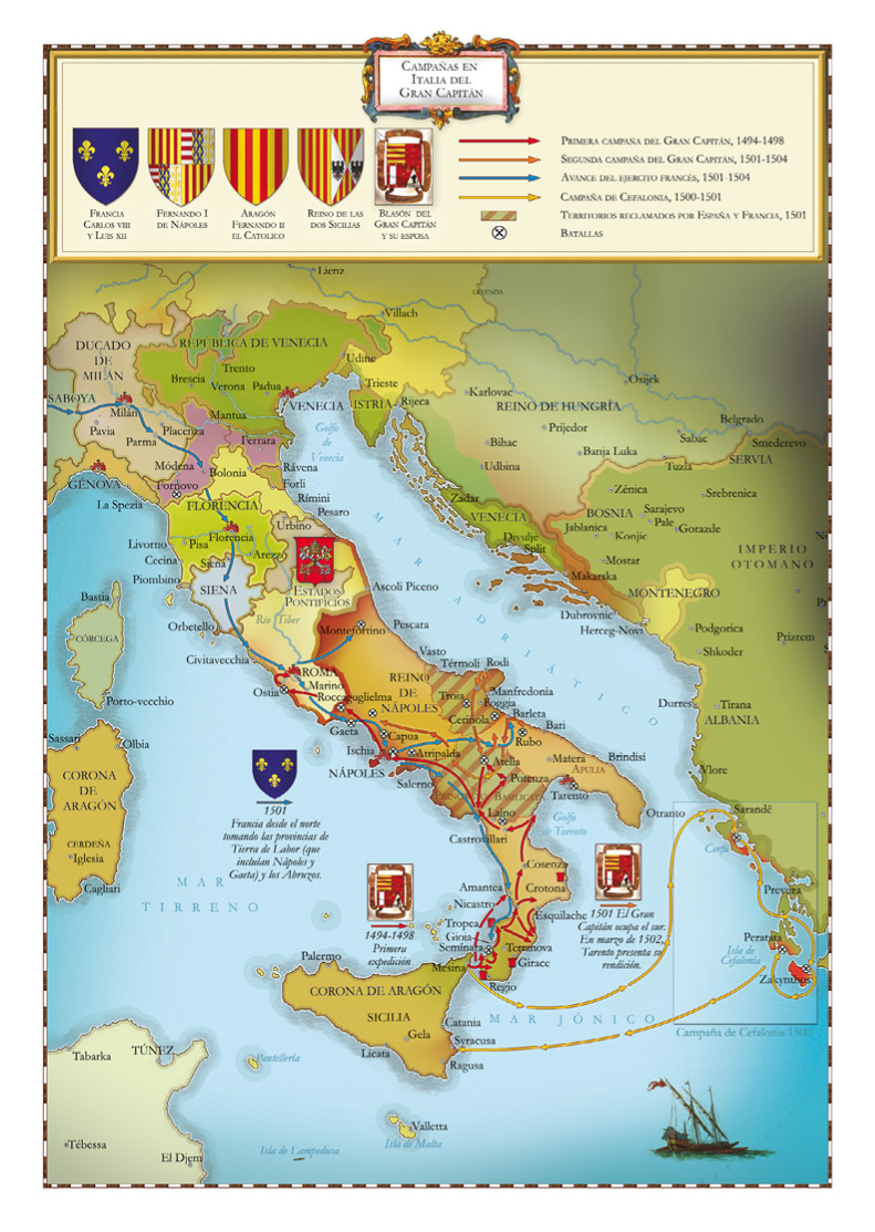 La península italiana durante el Renacimiento: un caos de territorios y señoríos en los que no solo ciudades Estado y familias rivales se disputaban el poder a nivel local, sino que sirvió de teatro de guerra entre España y Francia, con el papado tratando de conseguir la hegemonía mediante un juego de equilibrios.