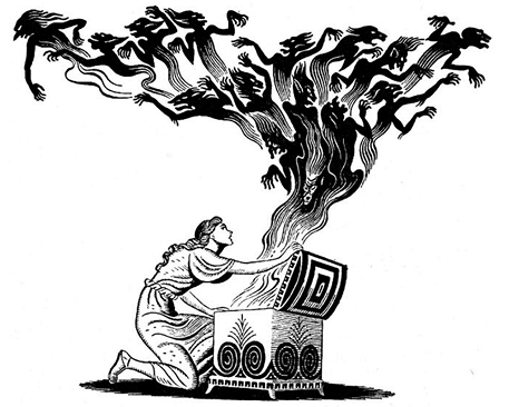 Parecida etiqueta dejaron estampada los griegos sobre Pandora, quien, según el mito, fue al mismo tiempo un regalo y un escarmiento que los dioses olímpicos decidieron darle a la humanidad — una humanidad hasta entonces compuesta solo por varones —. Como Eva en la tradición judeocristiana, los griegos consideraron que la caja abierta por Pandora fue la puerta de entrada de todos los males y los sufrimientos que recorren este mundo, tornándolo imperfecto e inadecuado. La mujer, construida y ataviada bellamente por los dioses, fue creada deliberadamente como una figura del mal, de la que más vale desconfiar. Porque, como sentenciaba Hesíodo, confiar en una mujer, ese ser seductor, es confiar en un engaño.