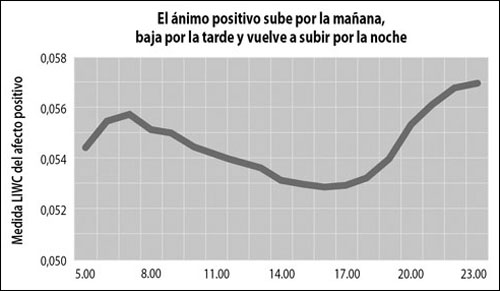 Hace unos años, dos sociólogos de la Universidad Cornell, Michael Macy y Scott Golder, analizaron más de quinientos millones de tuits que 2,4 millones de usuarios de 84 países habían publicado durante un período de dos años. Esperaban utilizar este tesoro para medir las emociones de la gente; en particular, el «afecto positivo» (emociones como el entusiasmo, la confianza propia y el estado de alerta) y el «afecto negativo» (emociones como la ira, la apatía y el sentimiento de culpa) variaban a lo largo del tiempo. Los investigadores no leyeron uno por uno esos quinientos millones de tuits, naturalmente. Lo que hicieron fue cargar los mensajes en un potente programa informático de análisis de texto, de uso muy extendido, llamado LIWC (Linguistic Inquiry and Word Count) que valoraba cada palabra en función de la emoción que transmitía.