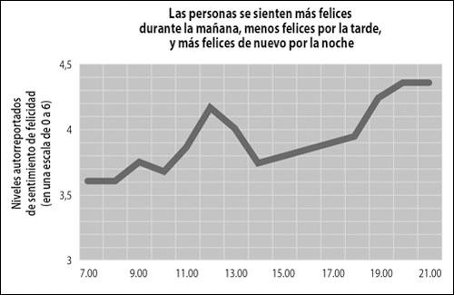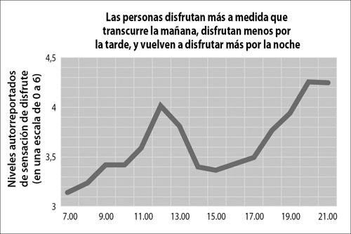 A pesar de su volumen, los cientos de millones de tuits no pueden proporcionar una visión perfecta de nuestra vida diaria. Aunque otros estudios que utilizan Twitter para medir el estado de ánimo han encontrado muchos de los mismos patrones que descubrieron Macy y Golder, tanto el medio como la metodología tienen sus límites.10 La gente utiliza a menudo las redes sociales para presentar una cara ideal al mundo que podría enmascarar sus verdaderas —y acaso menos ideales— emociones. Además, las herramientas analíticas de nivel industrial que se necesitan para interpretar tantos datos no siempre pueden detectar la ironía, el sarcasmo y otras sutiles artimañas humanas. Afortunadamente, los científicos de la conducta tienen otros métodos para entender qué pensamos y qué sentimos, y uno de ellos es especialmente bueno para trazar los cambios que se producen cada hora en cómo nos sentimos. Se llama «método de reconstrucción del día» (MRD), creado por un quinteto de investigadores, entre ellos Daniel Kahneman, premio Nobel de Economía, y Alan Krueger, que fue presidente del Consejo de Asesores Económicos de la Casa Blanca de Barack Obama. Con el MRD, los participantes en el estudio reconstruyen el día anterior, narrando todo lo que hicieron y cómo se sintieron mientras lo hacían. La investigación con el MRD ha demostrado, por ejemplo, que un día cualquiera la gente solía estar menos contenta en los desplazamientos y más contenta cuando se besa.11 En 2006, Kahneman, Krueger y el resto del equipo incorporaron el MRD para medir «un atributo del afecto que a menudo se pasa por alto: su ritmicidad en el transcurso de un día». Pidieron a más de novecientas mujeres estadounidenses —de diversas razas, edades y niveles de ingresos y estudios— que pensaran en el día anterior «como una serie continua de escenas o episodios de una película», con una duración de entre quince minutos y dos horas cada uno. Las mujeres explicaban después lo que habían estado haciendo durante cada episodio y elegían de una lista de doce adjetivos (feliz, frustrada, disfrutando, molesta, etcétera) los que representaban sus emociones durante ese tiempo.