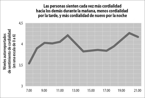 Cuando los investigadores procesaron los datos numéricos, descubrieron un «patrón bimodal fuerte y constante» —un doble pico— durante el día. El afecto positivo de las mujeres ascendía en las horas matutinas hasta que llegaba a un «punto emocional óptimo» al mediodía, más o menos. Después, su buen humor se desplomaba rápidamente y permanecía bajo durante la tarde, y después volvía a subir en las primeras horas de la noche.12