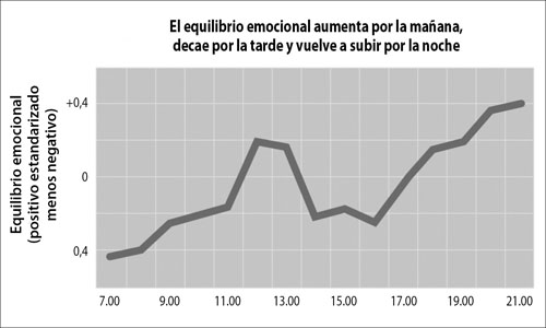 Las llamadas realizadas a primera hora de la mañana resultaban ser razonablemente optimistas y positivas. Pero a medida que avanzaba el día, «el tono se volvía más negativo y menos firme». En torno a la hora de comer, se recuperaba ligeramente el ánimo, probablemente porque los participantes cargaban sus baterías mentales y emocionales, conjeturaron los profesores. Por la tarde, sin embargo, aumentaba otra vez la negatividad, y el estado de ánimo no se recuperaba hasta después de la campanada de clausura del mercado. Además, este patrón se mantenía «incluso después de tener en cuenta factores como las normas de la industria, el estrés financiero, las oportunidades de crecimiento y las noticias que estaban transmitiendo las empresas».13 Dicho de otro modo, incluso cuando los investigadores tuvieron en cuenta las noticias económicas (una ralentización en China que ponía trabas a las exportaciones de la compañía) o los datos fundamentales de la empresa (una compañía que reportara unos pésimos resultados trimestrales), las conferencias vespertinas «eran más negativas, irritadas y combativas» que las conferencias matutinas.14