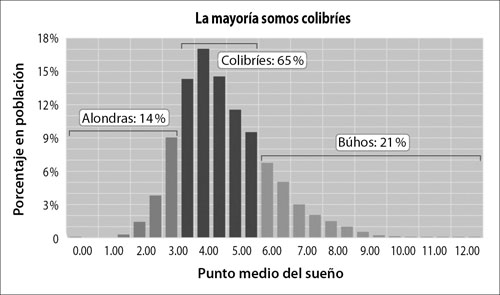 Lo más probable es que no seas completamente ni una alondra ni un búho, sino que estés en algún punto intermedio: el colibrí.32 Roenneberg y otros han descubierto que «las horas de sueño y vigilia presentan una distribución casi gaussiana (normal) en una población determinada».33 Es decir, que si trazas los cronotipos de la población en un gráfico, el resultado se asemeja a una curva de campana. La única diferencia, como se puede ver en el gráfico, es que los búhos extremos son más numerosos que las alondras extremas; los búhos tienen, desde el punto de vista estadístico, si no fisiológico, una cola más larga. Pero la mayoría de las personas no son ni búhos ni alondras. Según varios estudios sostenidos durante décadas en diferentes continentes, entre el sesenta y el ochenta por ciento de nosotros somos colibríes.34